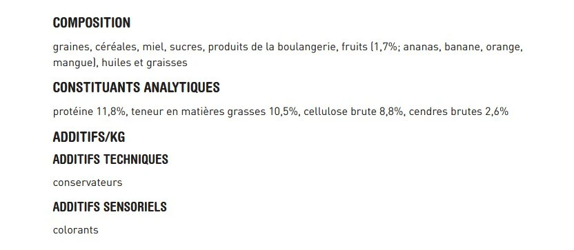 Les bâtonnets aux fruits exotiques Versele-Laga pour grandes perruches sont un délicieux mélange de graines, céréales, de banane, orange, ananas et mangue. Ils sont idéals pour occuper et stimuler votre oiseau tout en le gâtant ! Facile à accrocher dans la cage ou volière, ils sont cuits au four et tellement adorés.