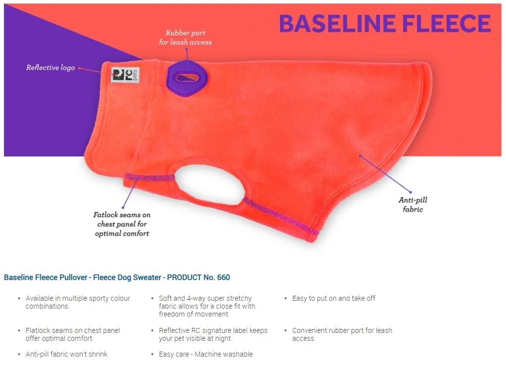 Les manteaux Baseline Fleece Pullover pour Chiens et Chats de la compagnie Rc Pets sont idéals pour les belles journées d’hiver, pour l’automne, le printemps et les animaux frileux. Fait de polar de haute qualité, ils ont un logo réfléchissant et une ouverture pour permettre de fixer la laisse à votre animal. Les manteaux Baseline Fleece Pullover font particulièrement bien aux chats et sont parfaits pour les sphynx, devon, rex qui ont très peu de poils.